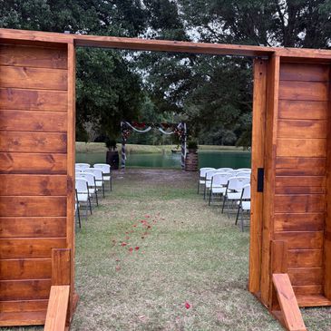 Add a touch of rustic elegance to your wedding day with our freestanding sliding barn doors with side walls. Create an unforgettable moment as the doors glide open for the bride’s grand entrance, setting the perfect tone for a beautiful celebration.